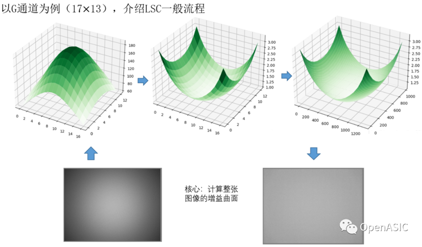 镜头阴影校正的过程如下图所示。可以看到由于镜头阴影的影响,图像亮度从中心向四周衰减,因此可以拟合一条校正曲线,根据像素点在曲线所处位置,从校正曲线上获得增益值,对像素点进行校正。