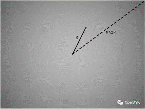 镜头阴影从图像中心到四周越来越严重,且基本是呈现中心对称的,根据镜头阴影的这个特点,提出了一种镜头阴影校正方法,即根据各像素点与图像中心的距离R计算出一个校正系数。如下图所示,该方法简单、复杂度低、占用内存少,但是镜头装配过程复杂,不存在这种完全对称的情况,因此,该方法镜头阴影校正的效果一般欠佳,不具有实际应用价值。