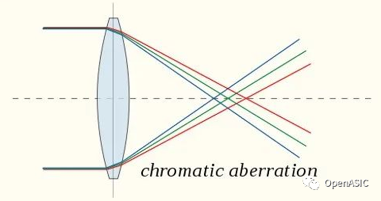镜头本身的光学特性(色散现象),如下图4所示,同一介质对不同波长光线的折射率不同,Sensor感受到光的位置会发生偏差。