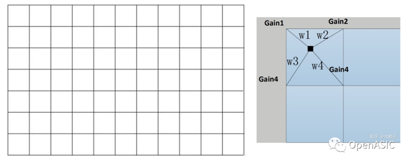 网格法虽然适应性较好,但是每块网格内具有相同的增益值,阴影校正的精度较差。在网格法的基础上做出了改进,引入了插值的思想。将图像等分成块,测出块四个顶点的增益值,落在块内部像素点的增益值根据四个顶点的增益值插值得出。改进的网格法如下图所示,可以适应非对称的模组情况,对阴影的校正效果更好,精度更高,缺点主要为计算量大、所占内存多。