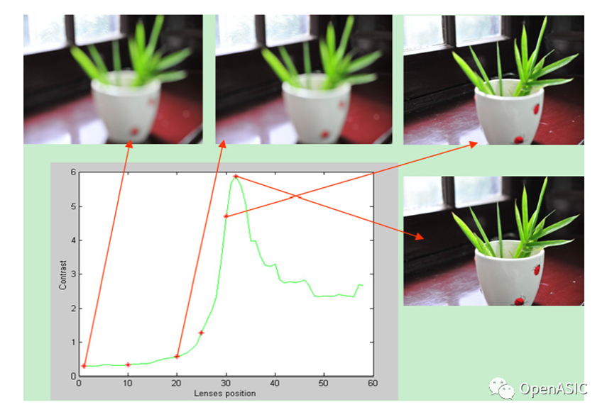 一个理想的对焦值评价及焦点搜索过程如下图2所示,可以看到,对比度最大位置处的图像最清晰,对焦值曲线也是单峰的。当对焦函数确定之后,如何找到最大对焦值对应的焦点,需要相应的搜索算法。