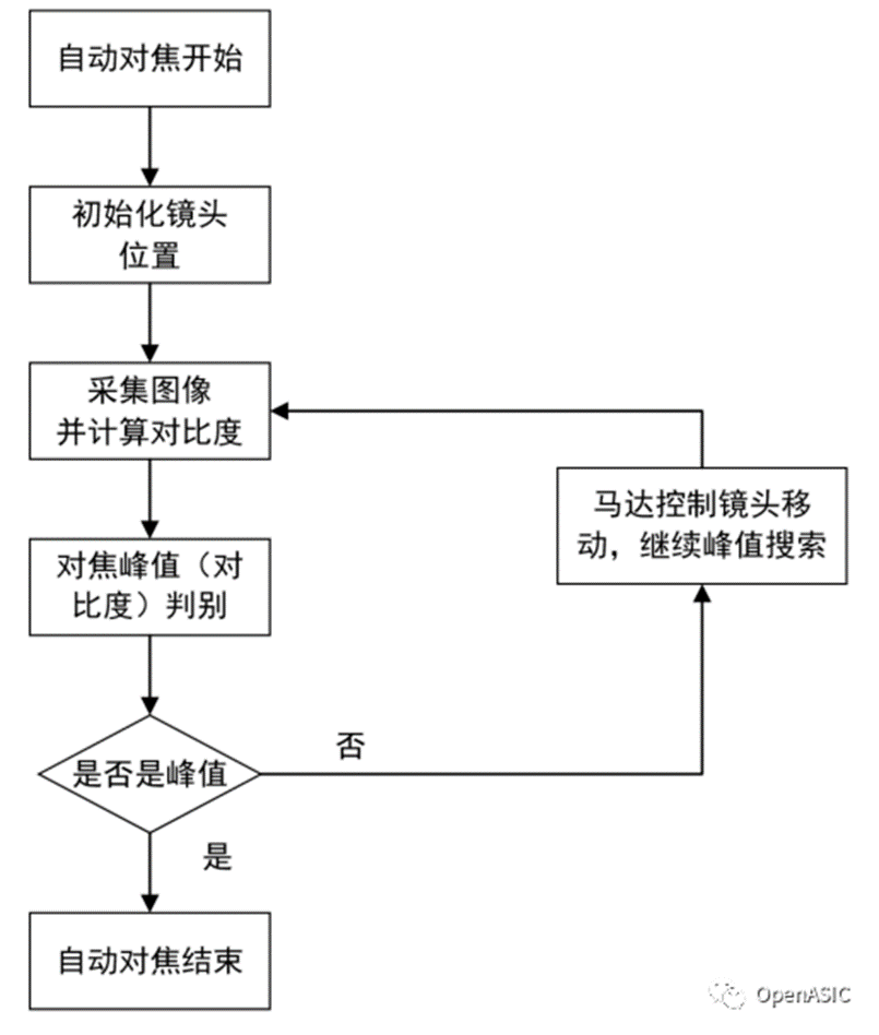 反差式自动对焦的基本原理可以概括为:随着镜头向合焦位置移动,图像越来越清晰,图像的对比度也越来越大,将寻找合焦位置的焦点转化为寻找图像最大对比度的过程。反差式对焦的主要优点在于对焦准确,环境适应能力强,光学设计原理简单。缺点在于对焦速度较慢,对噪声敏感,在物体本身对比度较低时会对焦失效。下图描绘了反差式对焦系统的一般框架。
