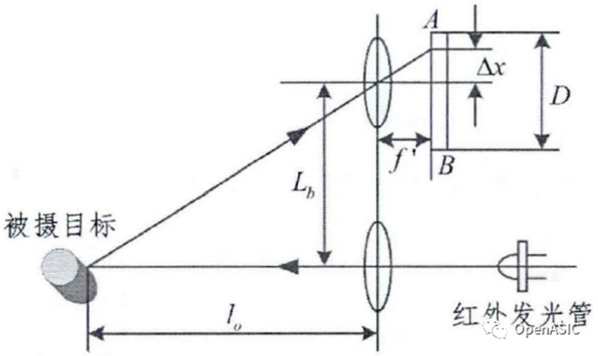 主动对焦使用传感器或测距工具测量出目标场景与镜头之间的距离,然后据此调焦而获得对焦准确的位置。主要分为红外线测距法、超声波测距法、PSD测距法等。主动对焦能适应各种光照情形,尤其是在低照度情况下也能正常工作,但是主动对焦成本更高,体积更大,便携性较差。下图是PSD测距法的原理示意图。
