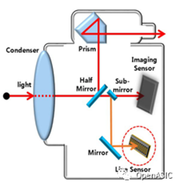使用相位差作为评价图像对焦程度的方法称为相差式对焦,它利用一对线性对焦传感器 (Line Sensor) 的相位差来调整焦距。这种对焦系统结构如下图所示,一部分入射到相机的光被半反射镜 (Half Mirror) 和子反射镜 (Sub-mirror) 向下反射到线性传感器上,向下反射的光通过透镜 (Mirror) 汇聚到两个单独的线性传感器上。相差式对焦优点在于对焦迅速、准确;缺点在于需要独特的硬件构造,结构复杂,造价高,环境适应能力差。