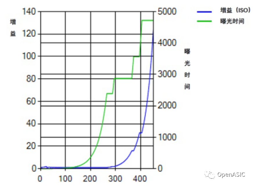 到达传感器的光通量大小由物理场景亮度、曝光时间、光圈和感光度(ISO)四者共同决定。对于手机以及其它电子产品使用的微型摄像头,光圈大小是固定的,物理场景亮度无法改变,所以大多数相机的自动曝光功能自动调节的是曝光时间和ISO。计算出当前图片的曝光度与目标曝光度的差异后,根据曝光曲线步进式调整相关参数。下图2是某品牌相机的内置曝光曲线,每个曝光量对应一组ISO和曝光时间参数,反映出曝光时间和曝光增益的对应关系。