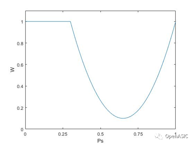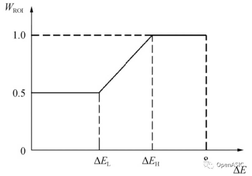 图像熵是一种特征的统计形式,它反映了图像中平均信息量的多少。在不同光照条件下得到的图像熵值不同。当图像曝光值改变时图像熵也随之改变,当图像曝光达到最佳时图像中包含的信息最多,图像熵值会达到最大,即图像中所含信息最多。图像中包含丰富灰度级的高复杂度区域为感兴趣区域,此区域中所包含的信息量很大,对图像的准确曝光就是对图像中感兴趣区域的准确曝光。对于含有较大图像熵的区域应赋予较大权重,相反地,含较小图像熵值的区域赋予较小权重,采用如下图所示的图像主体分配权重曲线。