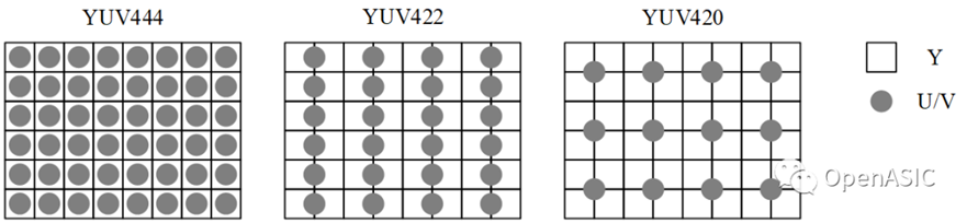 YUV色彩空间使用1个亮度分量 (Y) 和两个色度分量 (U、V) 来表示像素。在YUV家族中,YCbCr是应用最为广泛的,其中Cb指蓝色色度分量,Cr指红色色度分量。相较于亮度,人眼对色度的敏感程度更低,因此可以适当降低色度的采样精度来节约比特数,即色度亚采样。下图展现了常见视频采样格式中,亮度和色度样本的位置分布。以4:2:0格式 (YUV420) 为例,色度在垂直、水平方向上的采样精度,均只有亮度采样精度的1/2。