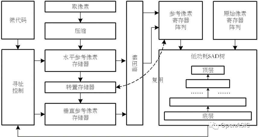 优化后的硬件架构仍将使用Fan[1]中提出的4×4块压缩和解压缩逻辑,水平-垂直参考像素存储器和低功耗32×32大小SAD引擎。本节提出的硬件设计的主要工作如下: