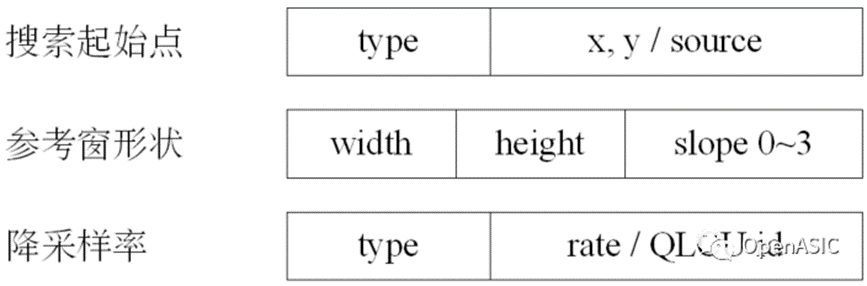 通过微代码(Micro-code)配置,每段微代码的长度为44个比特。其中:16个比特用来表示搜索的起始点,25个比特用来表示参考窗的形状,3个比特用来表示搜索的采样率。微代码的格式如下图6所示: