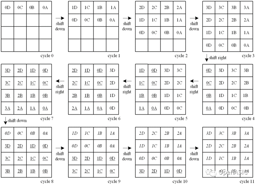 在本文提出的硬件设计中,转置模块将复用参考像素阵列。这不仅可以减少硬件代价,还可以提供“双工”数据传输。为了简化转置过程的说明,下图9展示了一个4×4块的转置过程。