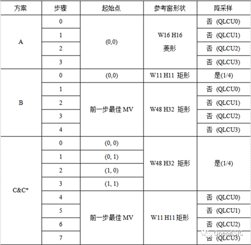 本文提出的IME架构不是针对某个特定的算法。相反的,该IME架构包括若干个搜索步骤,每步执行不同的搜索策略,这样可以组成各种搜索算法。在不同步骤中,这些参数可以被配置为不同的数值。具体来说,在每一步内,每个QLCU(Quarter LCU)内的所有PU采用同样的搜索配置,包括起始点,搜索窗的形状和降采样率。