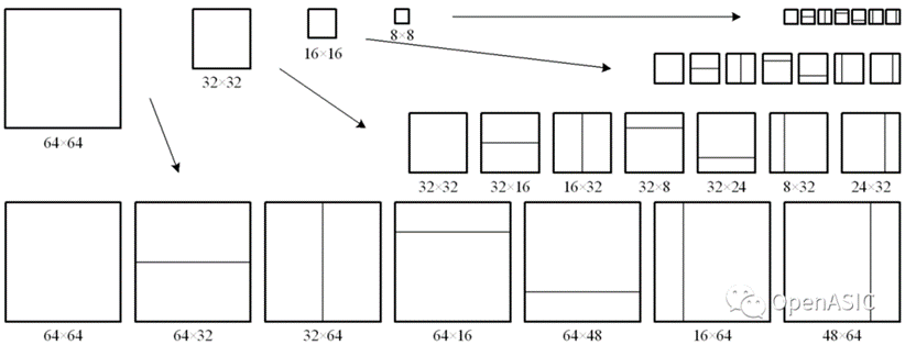 在HEVC标准中,“当前像素块”被称之为预测单元(Prediction Unit, PU)。当最大编码单元(Largest Coding Unit, LCU)的大小是64×64时,帧间PU的大小可以从64 × 64变化到4×4(本文中,“PU”指的都是“帧间PU”。)每一个PU都会被指定一个与之尽量相似的匹配块,该匹配块来自于已经编码了的图像帧,是编码端和解码端都能够获得的重建信息。下图给出了HEVC中的各种PU。