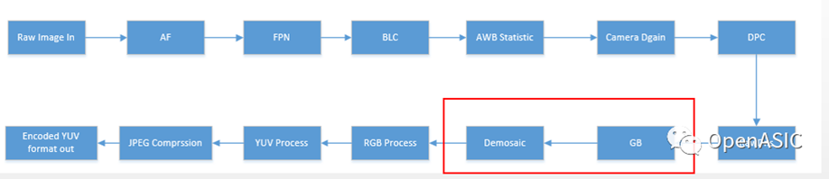 按照图像处理域分类,从相机获取Raw图到生成可查看的压缩YUV格式JPEG图像,需要经过Raw域、RGB域和YUV域三个主要处理域。绿平衡模块(GB:Green Balance)处于Raw域,经过绿平衡处理后的图像进入Demosaic模块进行处理后完成Raw格式向RGB格式的转换,Raw格式和RGB格式的相关概念参见资料1[1]。