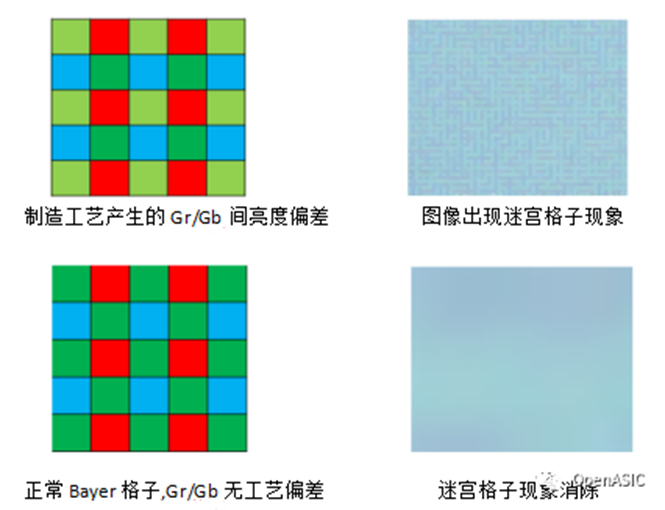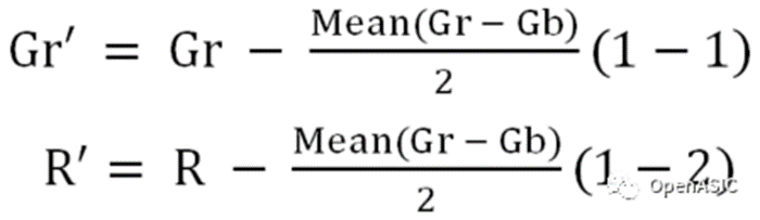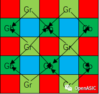 解决迷宫格子现象的思路是均衡Gr和Gb通道之间的亮度差异。对于Raw格式图像中的R/Gr像素,需要减去其与邻近区域中Gb均值的差异;对于B/Gb像素同理,如下图实例所示: