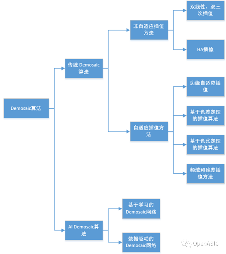 常见去马赛克插值算法的分类可如图2.2所示,接下来根据算法分类,选取典型的Demosaic算法进行简要介绍。