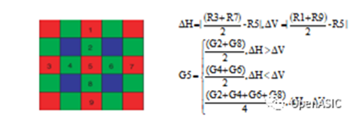 (式中R1、R3、R7、R9分别代表待插位置5垂直和水平方向上的四个已知R色度值,R5为位置5已知的R色度值;G2、G4、G6、G8分别代表位置5周围的已知G色度值,根据位置5周围同色梯度较小方向的G值信息完成G值插值)