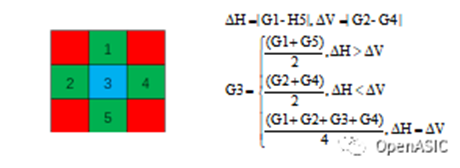 (式中G1、G2、G4、G5分别代表待插位置3附近3*3范围内的四个已知G分量值,G3为位置3完成插值后的G值)
