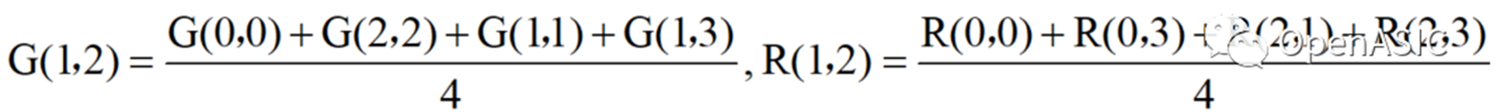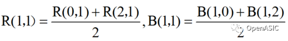 1.待插位置已知色度信息为G时,需要通过双线性插值计算RB。以插值(1,1)位置缺失B、R色度信息为例:
