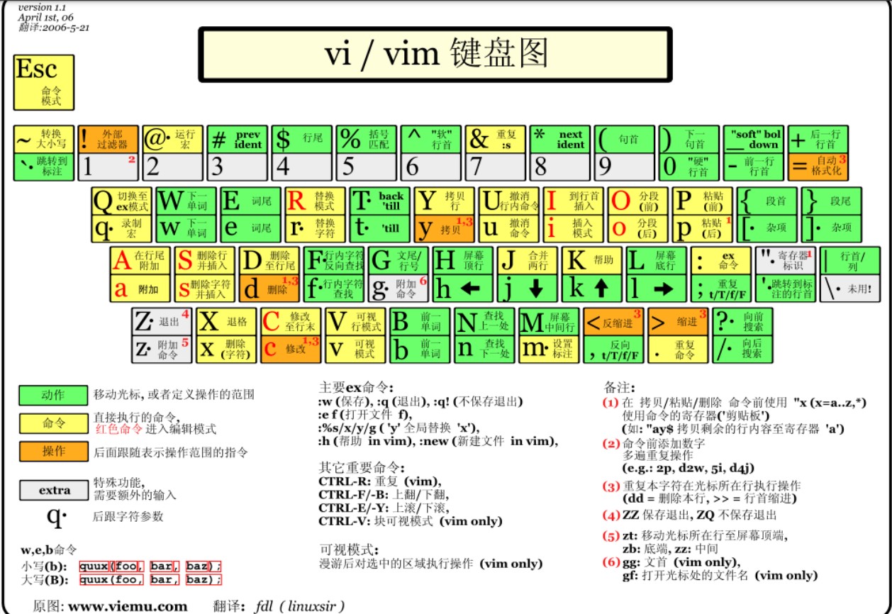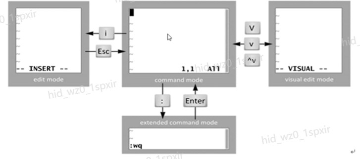 - 拓展命令(Extended command)或命令(末)行模式:保存,退出等操作