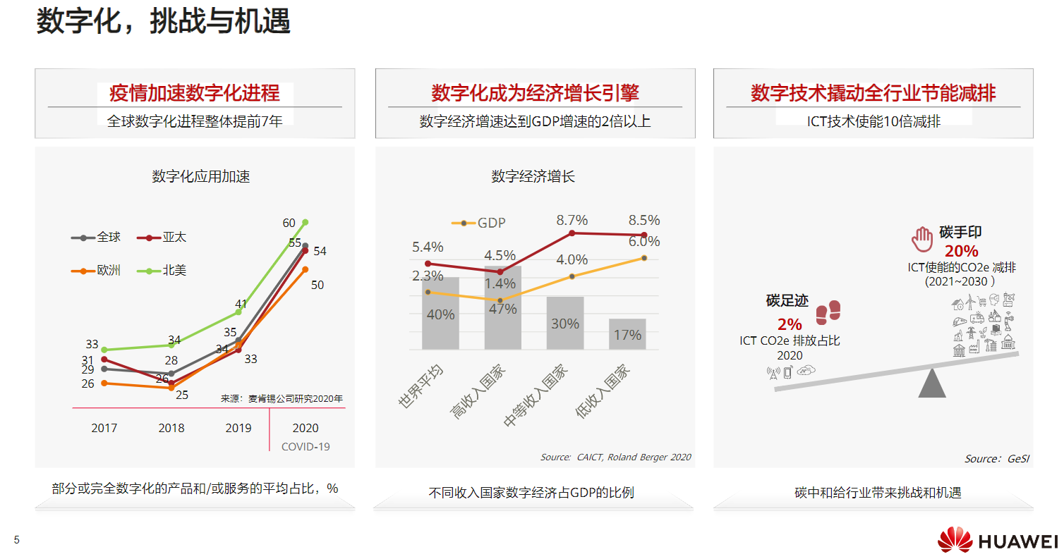 - 趋势一:社会数字化将在未来五年进一步上升。目前我国的数字化普及率刚刚超过 70%,与发达国家还有一定差距、存在较大提升空间;