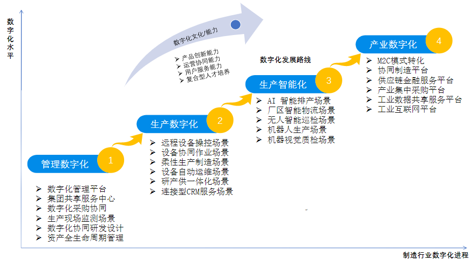 智能制造行业数字化发展路线总结为管理数字化、生产数字化、生产智能化、产业数字化四个阶段总路线,数字化文化和能力的培养贯穿整个数字化发展进程,在每个阶段具有代表性的重点场景.