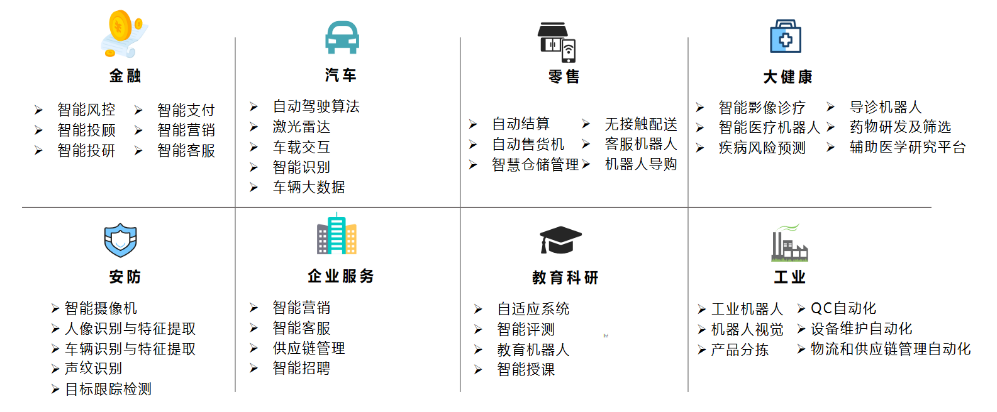 人工智能产业主要有智慧城市、智慧生产、智慧生活三大类应用领域,在制造业、电力电网、交通运输三大行业已形成规模应用,主要落地应用有以下十大场景:无人驾驶汽车、人脸识别、机器翻译、声纹识别、智能客服机器人、智能外呼机器人、智能音箱、个性化推荐、医学图像处理、图像搜索等。