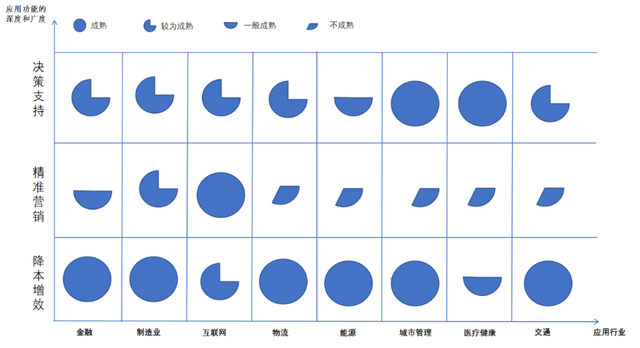 从应用的功能和成效来看,大数据技术应用的价值主要体现在降本增效、精准营销、决策支持三个方面,其应用的深度和广度,在不同行业呈现不同的侧重点。