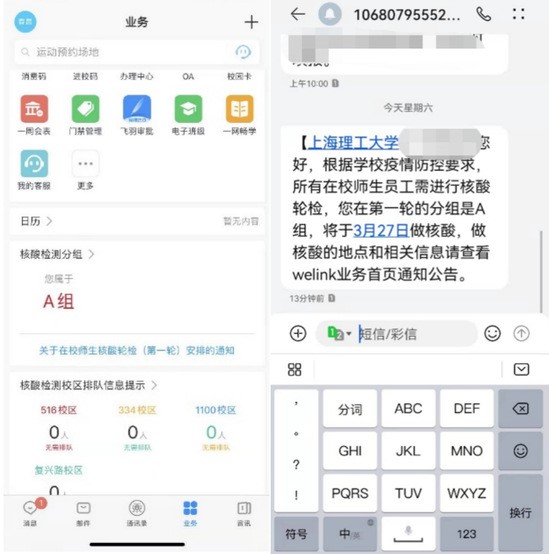 高校作为人员集中场所,在校人员基数不准一直是阻碍精准化管理的拦路石,也对核酸检测全员覆盖带来了考验。抗疫先锋队结合实际不断调整核酸检测方案,紧急开通WeLink线上核酸排队及核酸检测分组信息,并通过短信平台向每一位在校学生发送短信告知其相关信息,实现了有效有序的核酸检测。