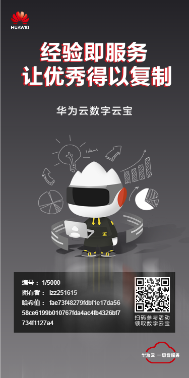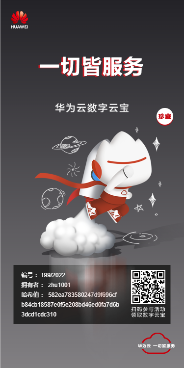 就在最近,我们推出了基于NFT的数字云宝。通过华为云花瓣链与用户ID的结合,可为领取到的用户生成用户独有的数字云宝特别证书,并附有云宝序号、数据哈希值等独特性与唯一性的信息,形成用户可收藏的数字资产。