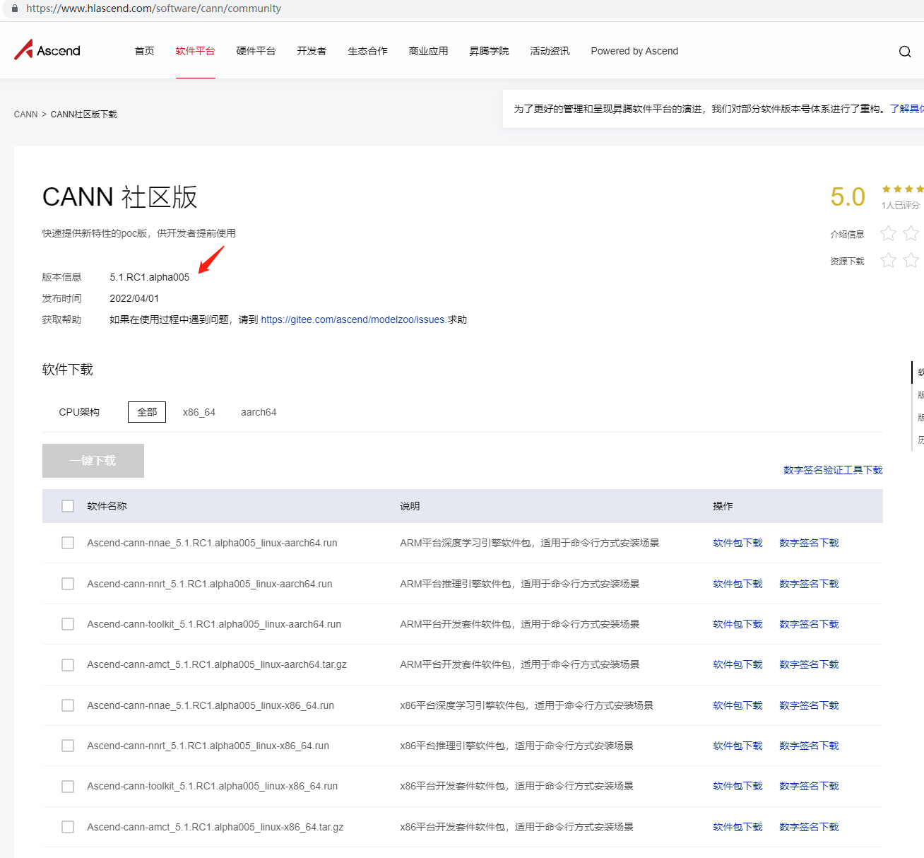 打开昇腾官网 https://www.hiascend.com/software/cann/community ,会发现CANN的版本已经升级到了5.1.RC1.alpha005.
