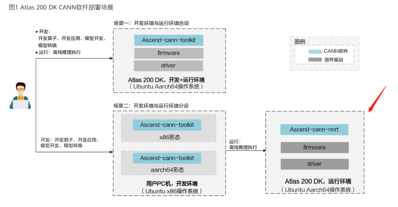 (1)开发环境——在Windows上安装Ubuntu 18.04 x86_64操作系统的虚拟机。并在其上安装CANN的toolkit的x86和aarch64(即ARM)两个版本。同时安装gcc和对应的交叉编译器。AI的项目工程放在这台x86服务器上,进行交叉编译,编译成能被 Atlas 200DK执行的程序版本。