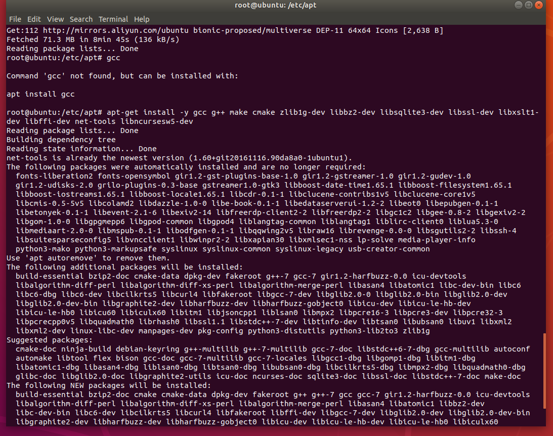 apt-get install -y gcc g++ make cmake zlib1g-dev libbz2-dev libsqlite3-dev libssl-dev libxslt1-dev libffi-dev net-tools libncursesw5-dev