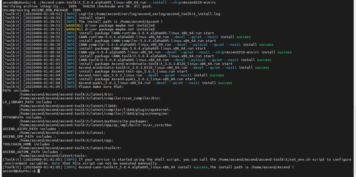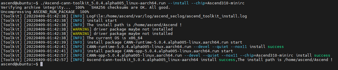 ./Ascend-cann-toolkit_5.0.4.alpha005_linux-aarch64.run --install --chip=Ascend310-minirc