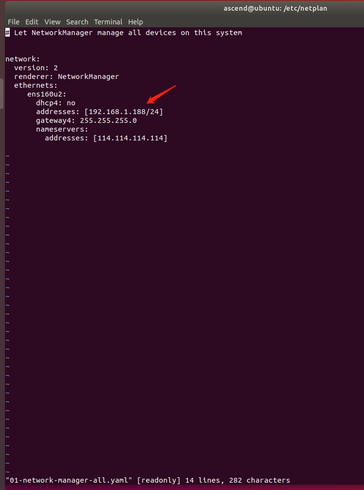 尽管USB线对应的IP还是上次换了个IP的地址,但是这也很容易地去修改 /etc/netplan/01-network-manager-all.yaml 换回来:
