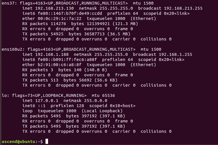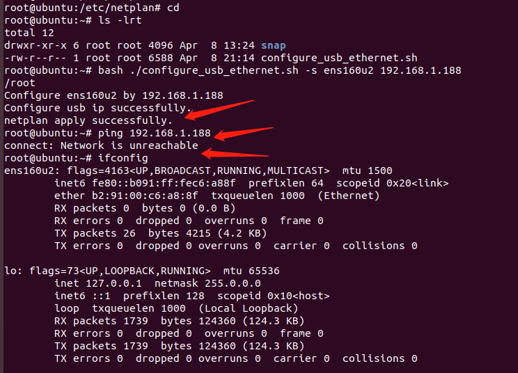 bash ./configure_usb_ethernet.sh -s ens160u2 192.168.1.188 配置好USB网卡。