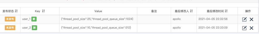 多值配置更加复杂,往往是单值配置在不同的 key 下,有不同的值。比如下面的配置,用户一和用户二的线程池大小和队列不同