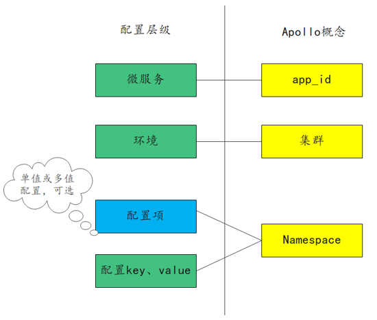 下图展示了业务概念和 Apollo 概念的对应关系,有些配置是单值配置,有些是多值配置,所以配置项这一层级是可选的。