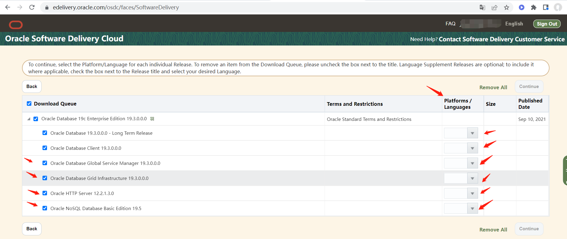 可以在左边选择需要安装的组件,建议一般选择 Oracle Database 19.3.0.0.0 ,右边platform选择Linux X86即可。