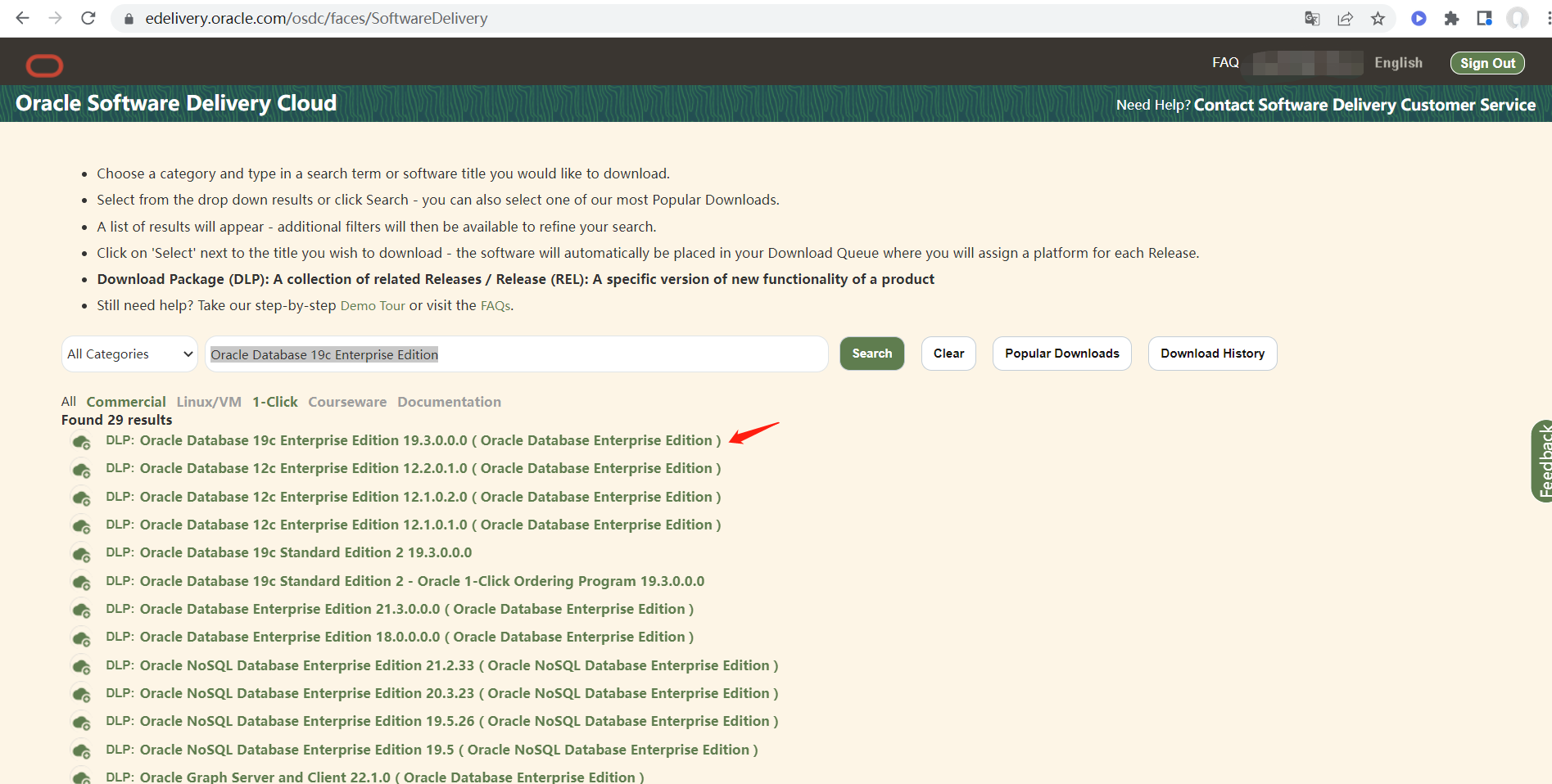 在上面的搜索栏搜索 Oracle Database 19c Enterprise Edition