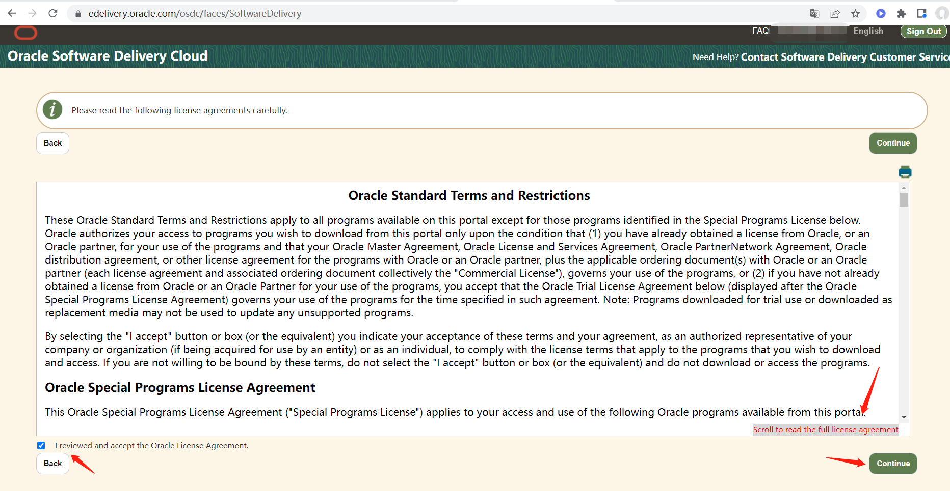 在此界面选择同意license,并滚动鼠标看一遍(看不看随你),然后点击continue: