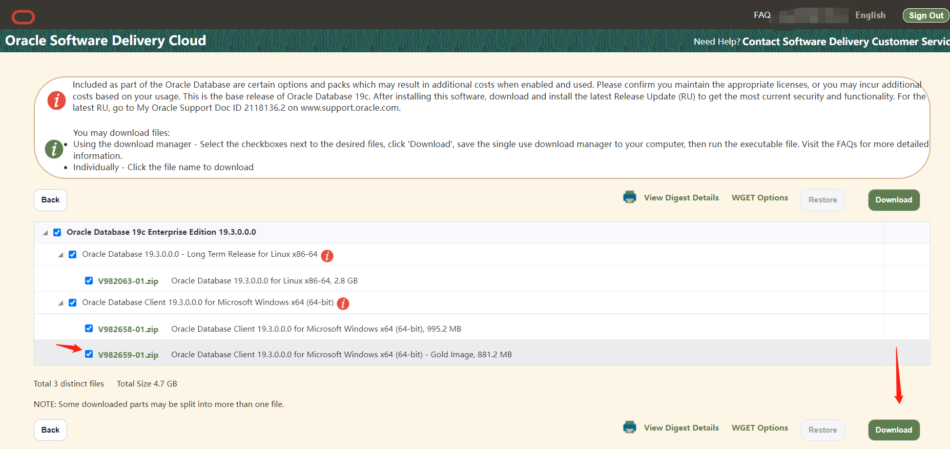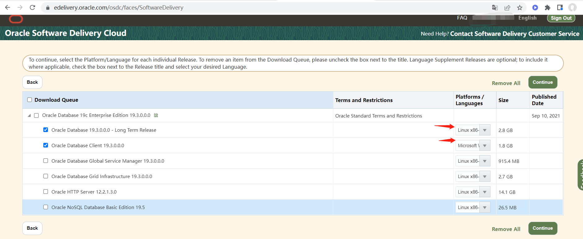 点击第一个Oracle 19c,系统会将其加入到“购物车”
