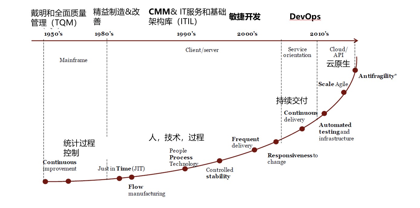 软件工程的变迁历经了一系例阶段,IT企业也跟随着软件工程变迁的脚步,投资人力和财力在组织中引入CMM、ITIL、敏捷、DevOps等,以保证自己能够紧跟时代的变化,保持住自己的竞争力,让自己在这个VUCA时代不仅仅能够立足,并且拥有自己的一席之地。