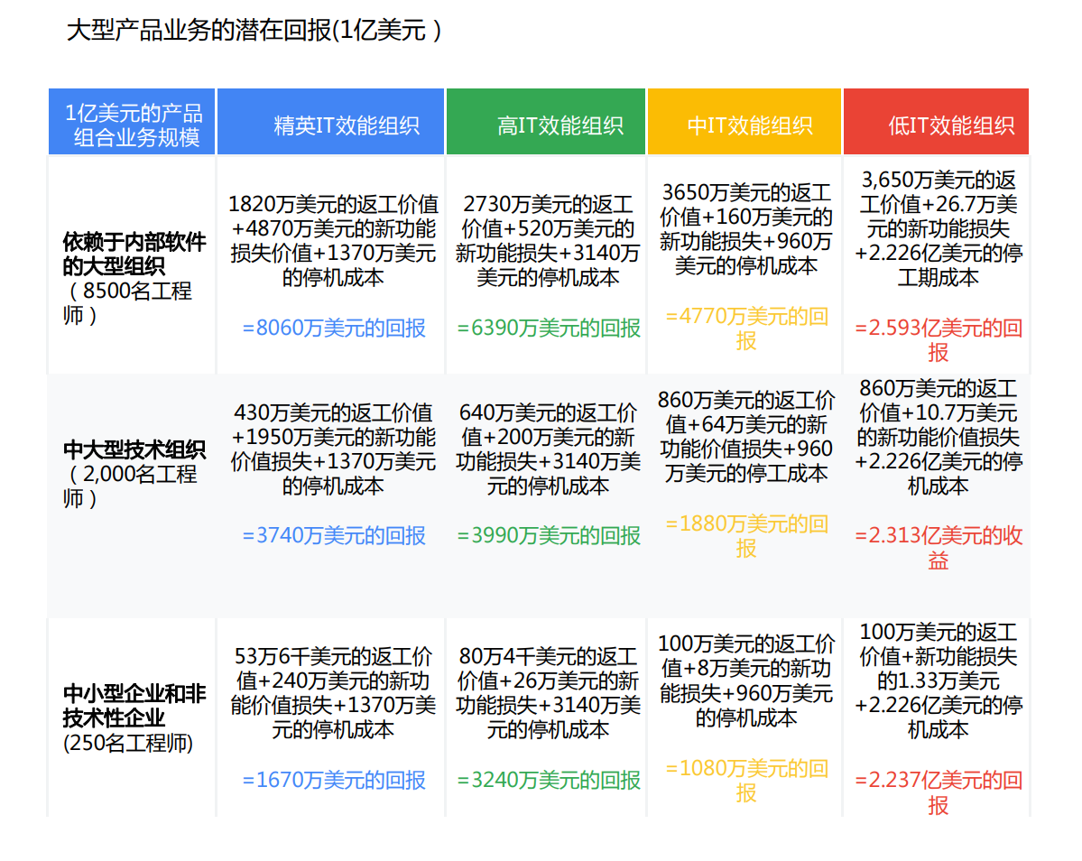 白皮书中是基于《加速度:DevOps 状态报告》的数据,以大型产品业务(1亿美元)的潜在汇报为例,最后的计算结果如下。