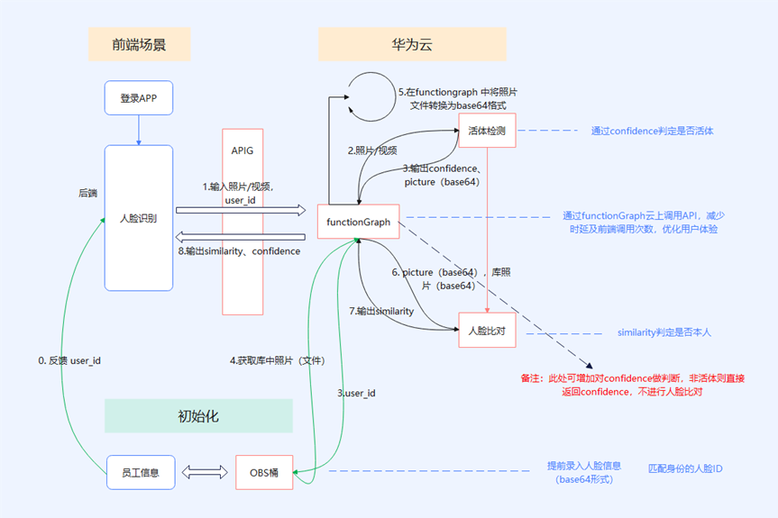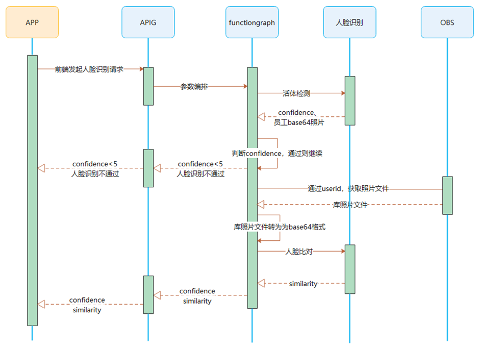 1、员工登录APP后,进行人脸识别时,将通过APIG来调用functionGraph,上传关键信息:摄像头捕获的照片或视频、员工的人脸库标识(user-id)。