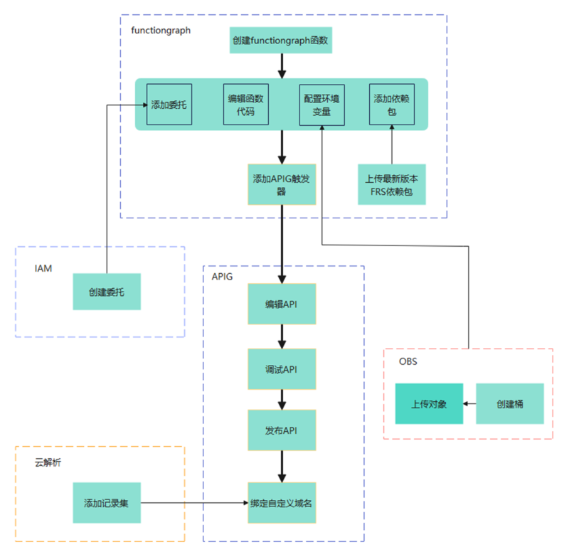 - 使用Functiongraph的函数,APP端只需考虑调用一个API,且只需考虑人脸识别的总体输入和返回结果。