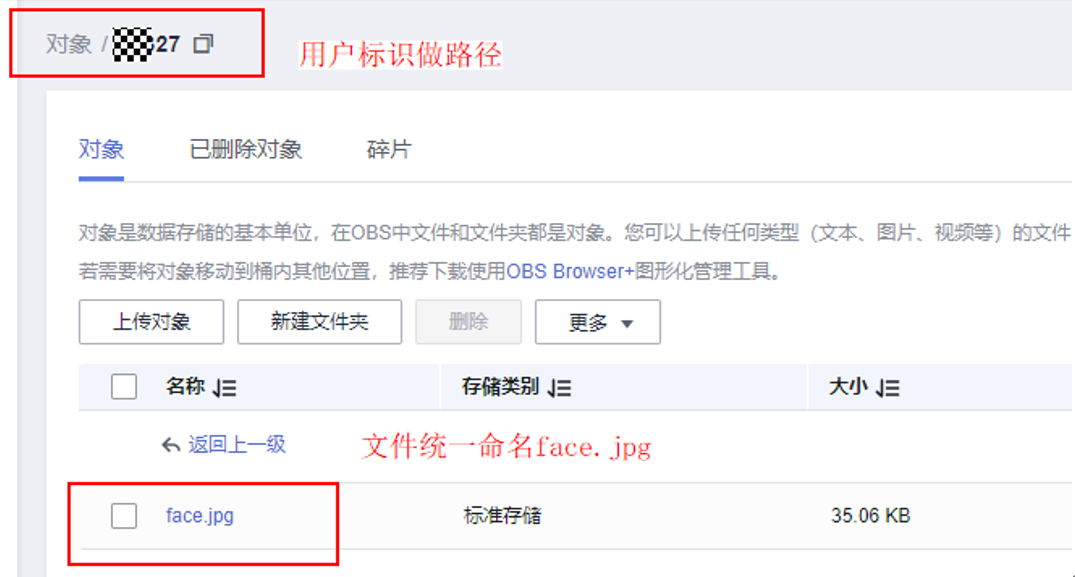 - OBS桶用来存储人脸照片,通过约定的用户标识做文件存储路径,易于管理和使用。
