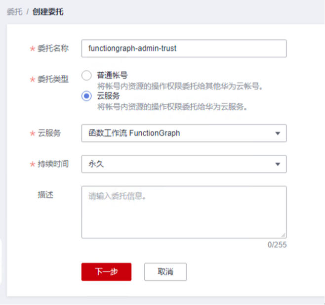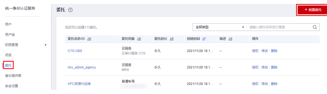 委托名称:选择创建的委托(如无,请点击右边的 创建委托 前往创建,创建步骤参考4.4.1)