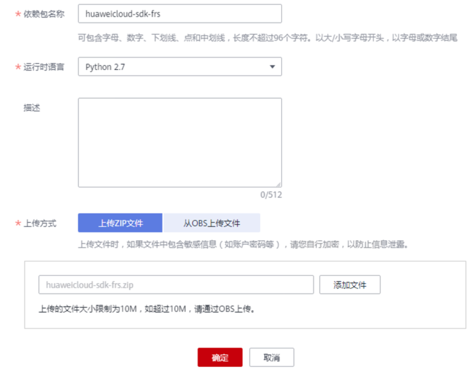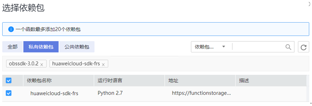 因functiongraph公共的依赖包中,FRS-SDK不是最新的(无静默活体检测API),故我们需上传最新的FRS-SDK,作为依赖包。