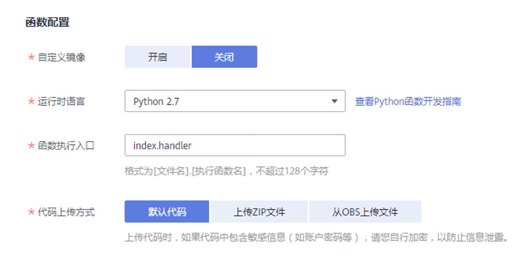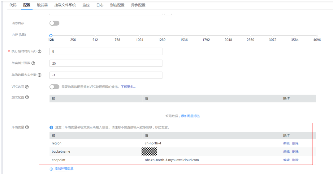 在函数菜单-配置页,添加环境变量:region、bucketname(OBS桶名)、endpoint