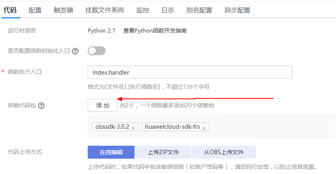 1)在函数菜单-代码页,点击添加-依赖代码包